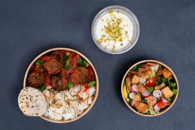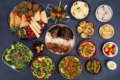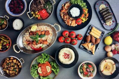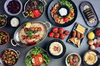 Les menus incluent des spécialités méditerranéennes comme le houmous, le caviar d'aubergine, les feuilles de vigne, les falafels, le shawarma ou encore le moussaka. Les desserts traditionnels tels que le baklava ou le mohallabieh sont également proposés.