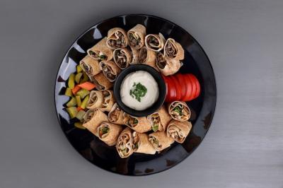Houmous, caviar d’aubergine, salade boulghour, Kebbé (boulette de viande) falafel, mini brochette de poulet, beignet de viande de bœuf, beignet fromage
