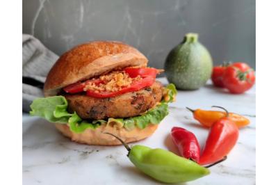 Pain artisanal, galette de légumes (poivrons), salade, tomates, oignons rouges, sauce maison